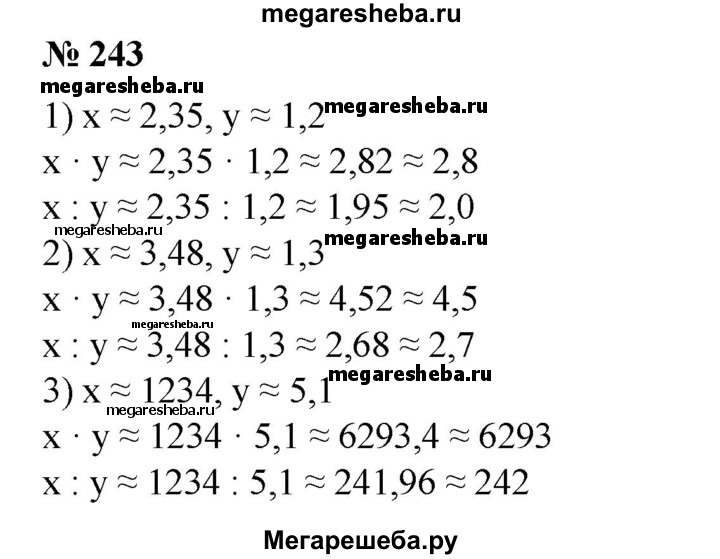 243. С помощью правила 2 найти приближенные значения х * у и х : у, если: 1) х ≈ 2,35, у ≈ 1,2; 2) х ≈ 3,48, у ≈ 1,3; 3) х ≈ 1234, у ≈ 5,1; 4) х ≈ 2,7, у ≈ 3021.