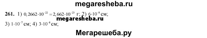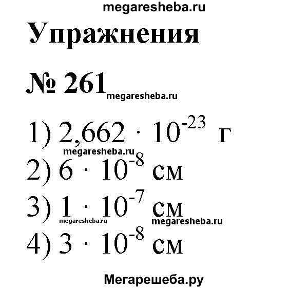 261. Записать в стандартном виде число, выражающее: 1) массу атома кислорода 2) толщину пленки мыльного пузыря 0,00000006 см; 3) единицу длины ангстрем (применяется в молекулярной физике) 0,0000001 см; 4) диаметр молекулы воды 0,00000003 см.