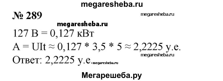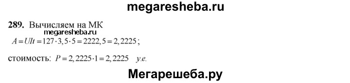 289. Электрическая плитка работала t = 5 ч при напряжении U ≈ 127 В и силе тока I ≈ 3,5 А. Рассчитать стоимость (в копейках) затраченной электрической энергии А (кВт * ч) при тарифе 13 к. за 1 кВт * ч (А = UIt).