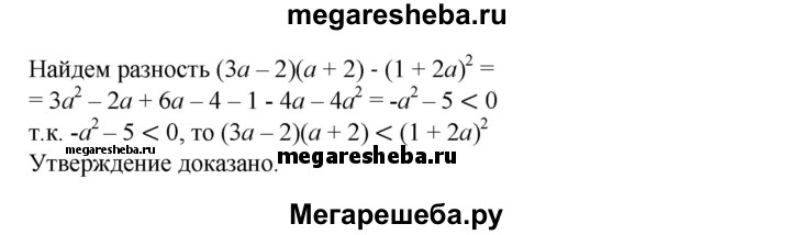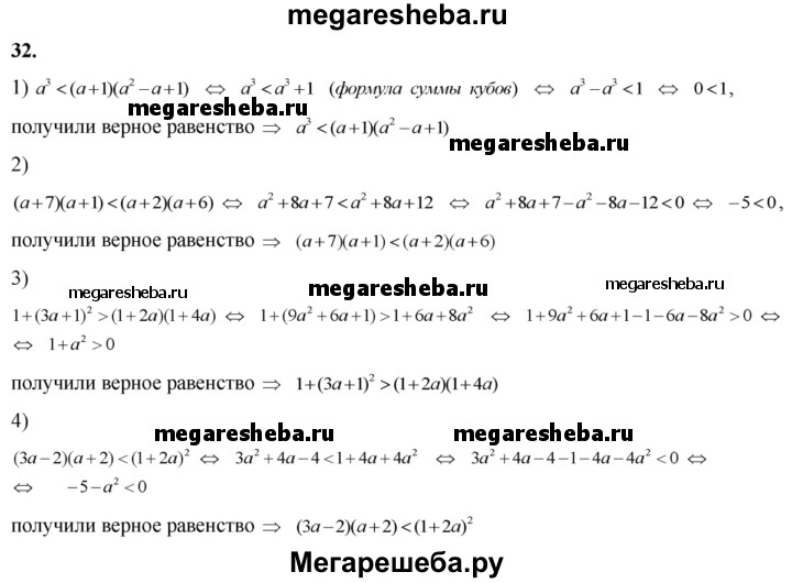 32. Доказать, что при любых значениях а верно неравенство: 1) a^3 < (a+1)(a^2-a+1); 2) (a+7)(a+1) < (a+2)(a+6); 3) 1+(3a+1)^2 > (1+2a)(1+4a); 4) (3a-2)(a+2)<(1+2a)^2.