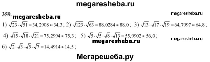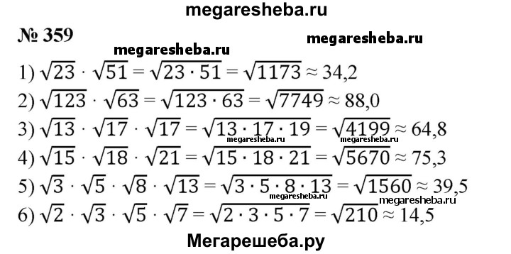 359. Вычислить на микрокалькуляторе с точностью до 0,1: 1) √23 * √51; 2) √123 * √63; 3) √13 * √17 * √19; 4) √15 * √18 * √21; 5) √3*√5*√8*√13; 6) √2 * √3* √6 * √7.
