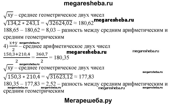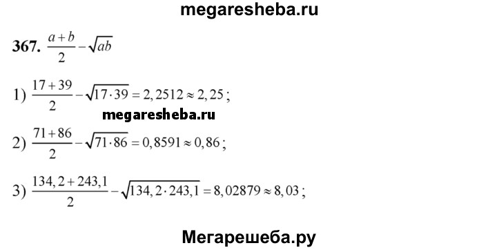 367. На микрокалькуляторе вычислить с точностью до 0,01 разность между средним арифметическим и средним геометрическим чисел: 1) 17 и 39; 2) 71 и 86; 3) 134,2 и 243,1; 4) 150,3 и 210,4.