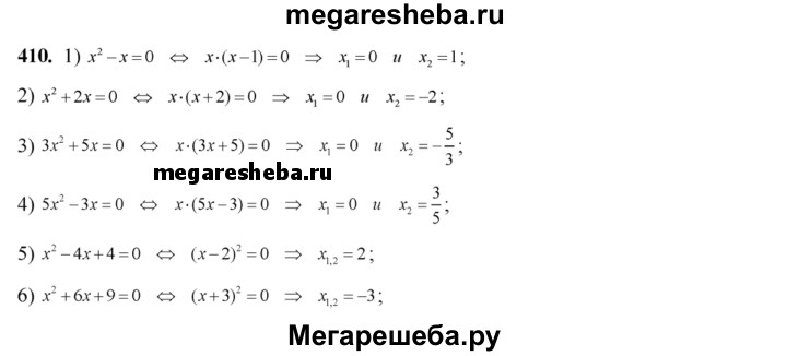 410. Решить квадратное уравнение, разложив его левую часть на множители: 1) x^2 – x =0; 2) x^2 +2x = 0; 3) 3x^2 +5x = 0; 4) 5x^2 – 3x =0; 5) x^2 – 4x +4 =0; 6) x^2 + 6x +9 =0.