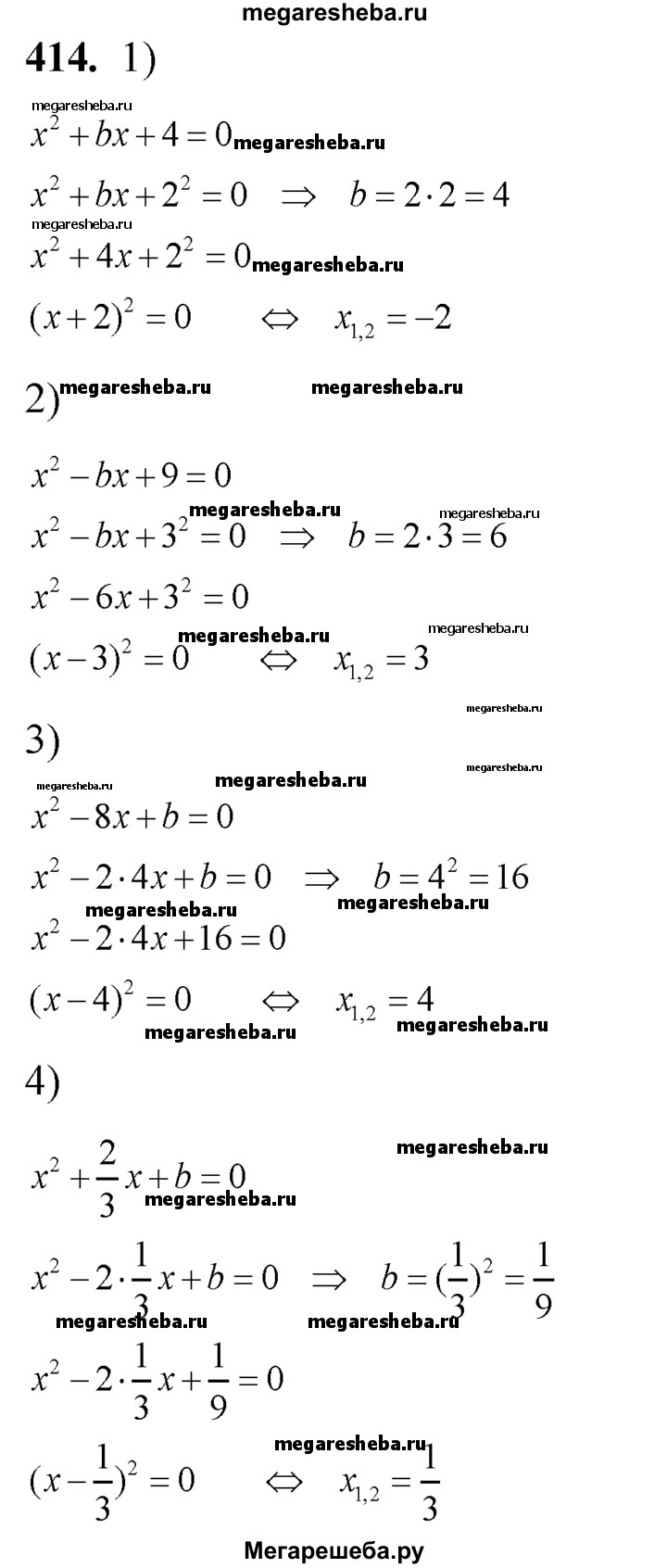 414. Найти такое положительное число Ь, чтобы левая часть уравнения оказалась квадратом суммы или разности, и решить полученное уравнение: 1) x^2+bx + 4 = 0; 2) х^2-bх + 9=0; 3) x^2 -8х + b = 0; 4) х^2 + 2/3х + b = 0.