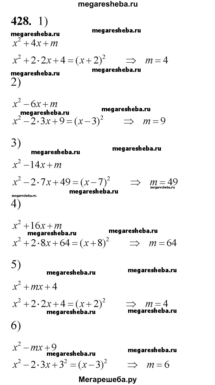 428. Найти такое положительное число т, чтобы данное выражение было квадратом суммы или разности: 1) х^2 + 4х + m; 2) х^2-6х + m; 3) х^2-14х + m; 4) х^2 + 16х + m; 5) х^2 + mх + 4; 6) х^2-mх + 9.