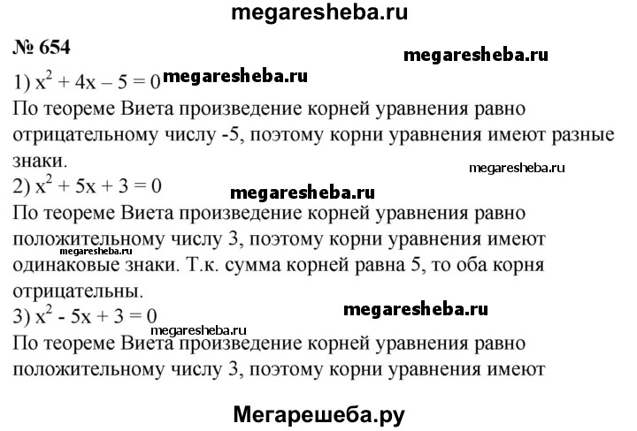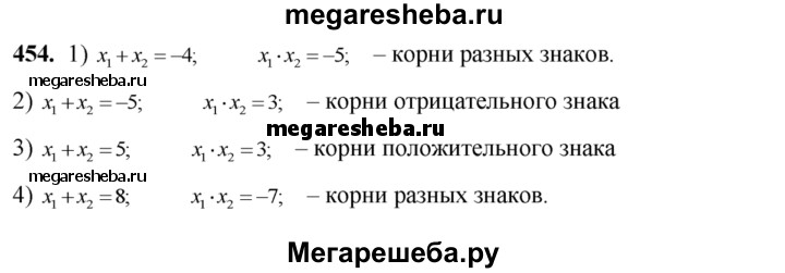 454. (Устно.) Не решая уравнения, имеющего корни, определить знаки его корней: 1) х^2 + 4х - 5 = 0; 2) х^2 + 5х + 3 = 0; 3) х^2-5х + 3 = 0; 4) х^2-8х-7 = 0.