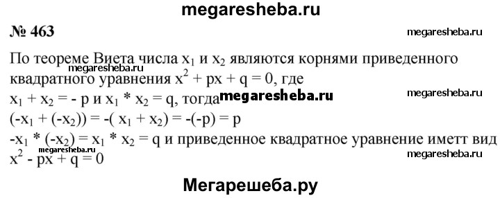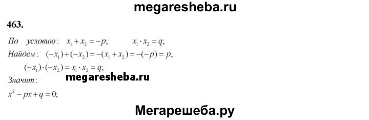 463. Пусть уравнение х^2 + рх + q = 0 имеет два действительных корня x1 и х2. Записать приведенное квадратное уравнение, имеющее корни –х1, и -х2.