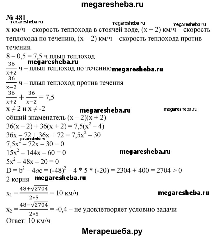 481. Прогулочный теплоход отправился вниз по течению реки от пристани А и причалил к пристани В. После получасовой стоянки теплоход отправился обратно и через 8 ч после отплытия из А вернулся на эту же пристань. Какова скорость теплохода в стоячей воде, если расстояние между пристанями А и В равно 36 км, а скорость течения реки 2 км/ч?