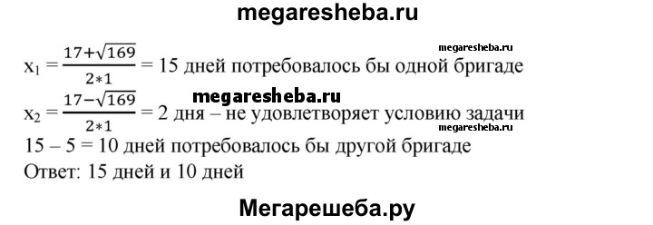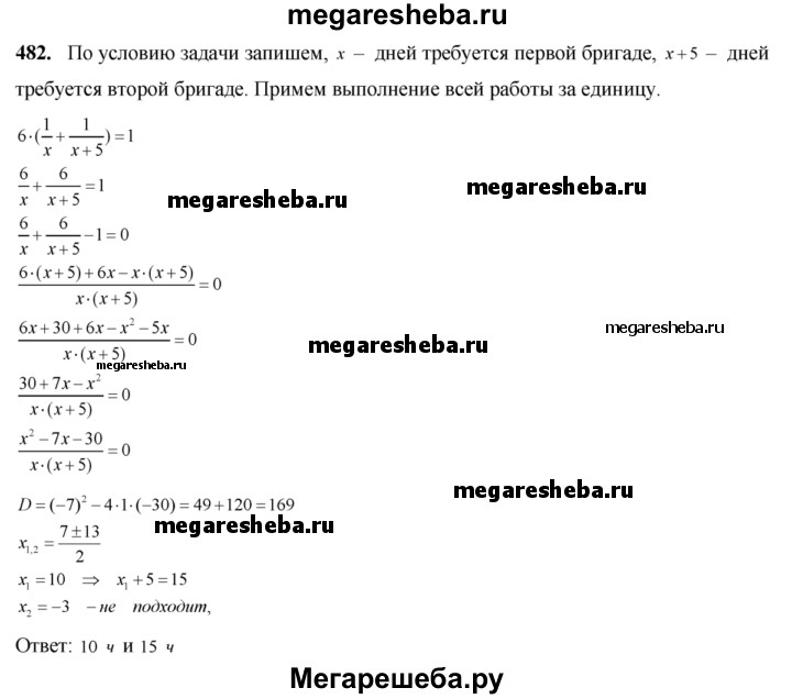 482. Две бригады, работая вместе, закончили заготовку леса за 6 дней. Сколько дней потребовалось бы каждой бригаде на выполнение этой работы, если одной из бригад для этого требуется на 5 дней меньше, чем другой?