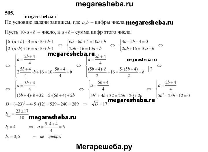 505. При делении двузначного числа на сумму его цифр в частном получается 6, а в остатке 4. При делении этого же числа на произведение его цифр в частном получается 2, а в остатке 16. Найти это число.