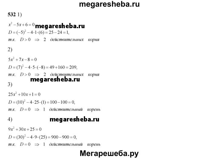 532. Не решая уравнения, определить, сколько действительных корней оно имеет: 1) х^2 - 5х + 6 = 0; 2) 5х^2 + 7х - 8 = 0; 3) 25х^2 — 10х + 1 = 0; 4) 9х^2 + З0х + 25 = 0.