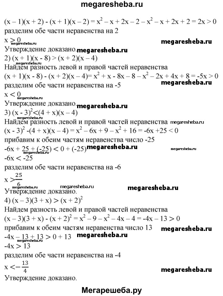 54. Доказать, что: 1) если (х - 1)(х + 2) > (х + 1)(х - 2), то х>0; 2) если (х + 1)(х - 8) > (х + 2)(х - 4), то х<0; 3) если (х-3)^2<(4+ х)(х-4), то х>25/6; 4) если (х-3)(3+х)>(х + 2)^2, то x < - 13/4.