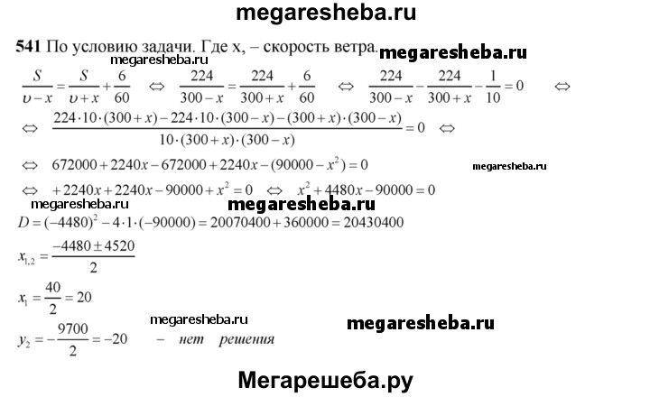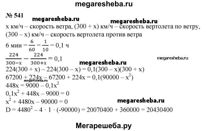 541. Скорость вертолета Ми-6 относительно воздуха равна 300 км/ч. Расстояние в 224 км вертолет пролетел дважды: один раз — по ветру, другой раз — против ветра. Определить скорость ветра, если на полет против ветра вертолет затратил на 6 мин больше, чем на полет по ветру. (При вычислении использовать микрокалькулятор.)