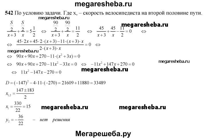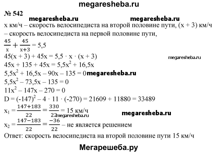 542. Скорость велосипедиста на первой половине пути была на 3 км/ч больше, чем его скорость на второй половине пути. С какой скоростью велосипедист проехал вторую половину пути, если весь путь в 90 км он преодолел за 5,5 ч?
