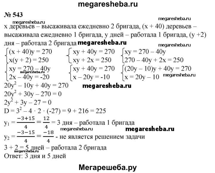 543. На посадке деревьев работали две бригады. Первая бригада ежедневно высаживала на 40 деревьев больше, чем вторая, и посадила 270 деревьев. Вторая бригада работала на 2 дня больше первой и посадила 250 деревьев. Сколько дней работала на посадке деревьев каждая бригада?