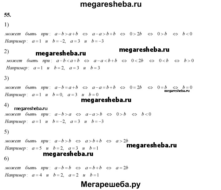 55. Может ли разность а-b быть: 1) больше суммы а + b; 2) меньше суммы а + b; 3) равна сумме а + b; 4) больше а; 5) больше b; 6) равна b? Привести примеры.