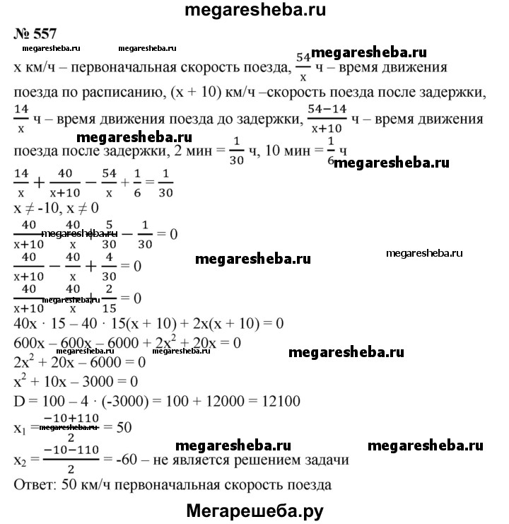 557. Поезд должен пройти 54 км. Пройдя 14 км, он был задержан у семафора на 10 мин. Увеличив скорость после этого на 10 км/ч, он прибыл на место назначения с опозданием на 2 мин. Определить первоначальную скорость поезда.