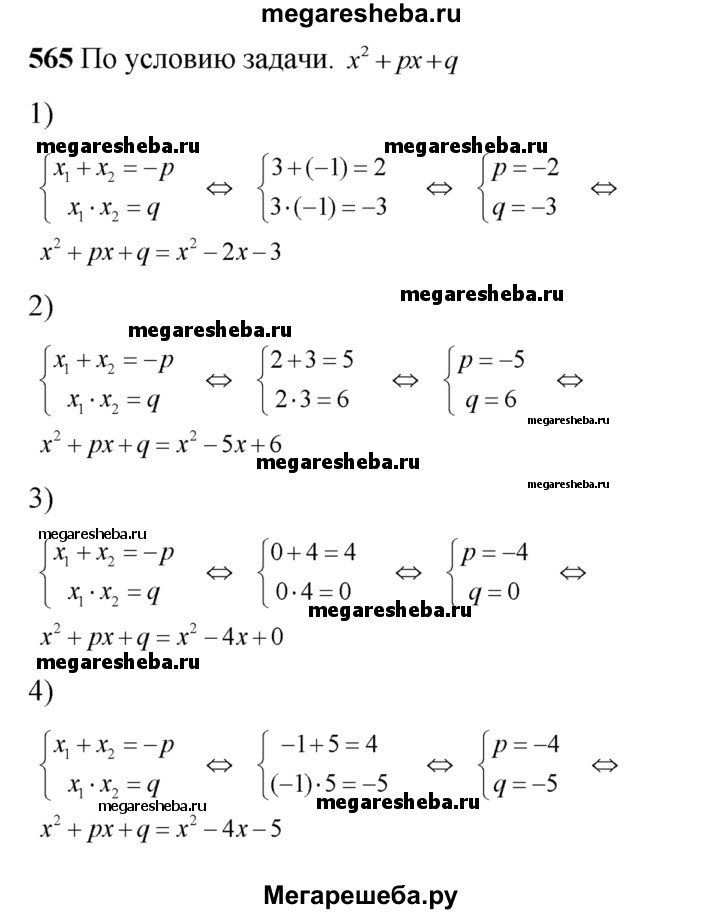 565. Записать приведенное квадратное уравнение, имеющее корни х1 и х2: 1) x1= 3, х2 = 1; 2) x1 = 2, х2 = 3; 3) x1 = 0, х2 = 4; 4) х1 = -1, х2 = 5.