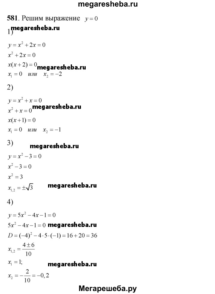 581. Определить, какие из чисел -2; -√3; -1; -0,2; 0; 1; √3 являются нулями квадратичной функции: 1) у=х^2 + 2х; 2) у = х^2 + х; 3) у = х^2- 3; 4) у = 5х^2 -4х - 1.