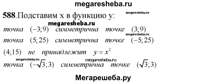 588. (Устно.) Найти координаты точек, симметричных точкам А (3; 9), В (-5; 25), С (4; 15), D(√3; 3) относительно оси ординат. Принадлежат ли все эти точки графику функции y= х^2?