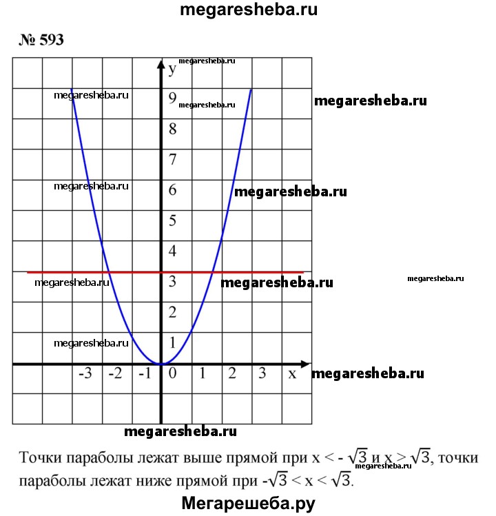 593. На одной координатной плоскости построить параболу у = х^2 и прямую у = 3. При каких значениях х точки параболы лежат выше прямой? ниже прямой?