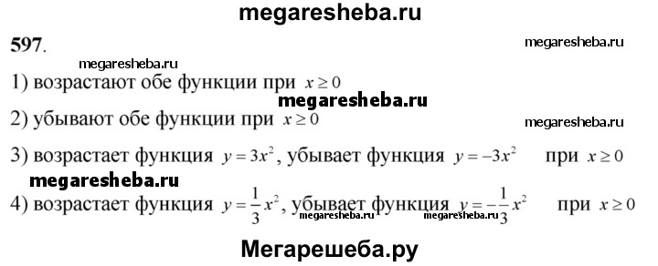 597. На одной координатной плоскости построить графики функций: 1) у = х^2 и у = Зх^2; 2) у = -х^2 и у = -Зх^2; 3) у = Зх^2 и y= -Зх^2; 4) y = 1/3x^2 и у = -1/3х^2. Используя графики, выяснить, какие из этих функций возрастают на промежутке х≥0.