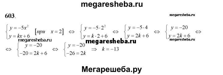 603. Найти значение k, при котором парабола у = -5х^2 и прямая у = kx + 6 пересекаются в точке с абсциссой х = 2. Имеются ли другие точки пересечения графиков?
