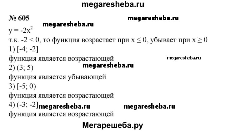 605. Выяснить, является ли функция у = -2х^2 возрастающей или убывающей: 1) на отрезке [-4; -2]; 2) на интервале (3; 5); 3) на отрезке [-5; 0]; 4) на интервале (-3; 2).
