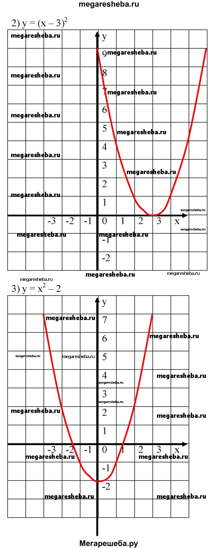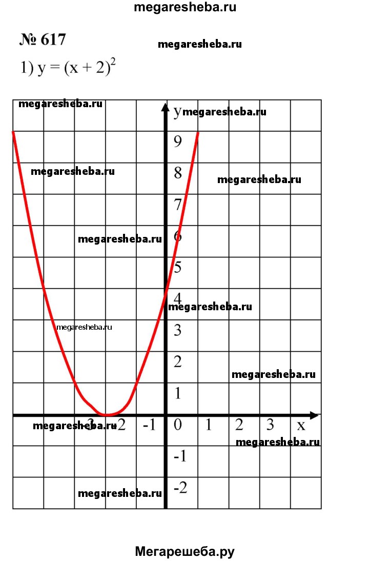617. С помощью шаблона параболы у = х^2 построить график функции: 1) у = (х + 2)^2; 2) у = (х- З)^2; 3) у = х^2-2; 4) у = -х^2 + 1; 5) у = -(х - 1)^2 - 3; 6) у = (х + 2)^2 + 1.