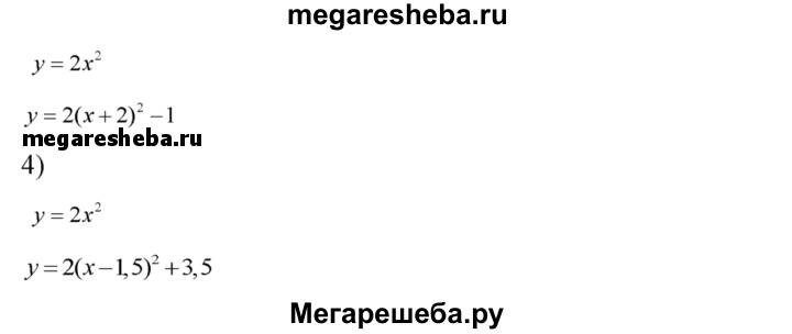 618. Записать уравнение параболы, полученной из параболы у = 2х^2: 1) сдвигом вдоль оси Ох на 3 единицы вправо; 2) сдвигом вдоль оси Оу на 4 единицы вверх; 3) сдвигом вдоль оси Ох на 2 единицы влево и последующим сдвигом вдоль оси Оу на единицу вниз; 4) сдвигом вдоль оси Ох на 1,5 единицы вправо и последую-щим сдвигом вдоль оси Оу на 3,5 единицы вверх.