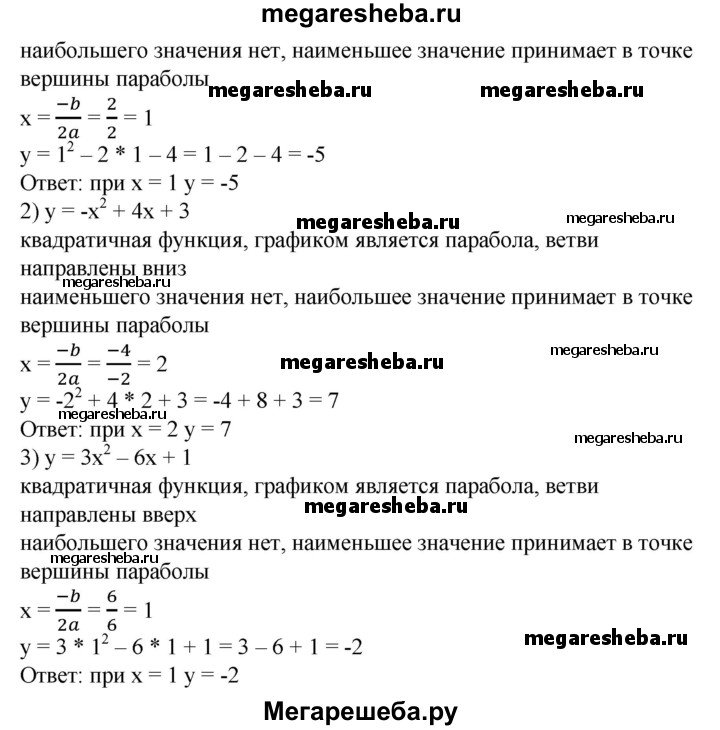 630. Не строя график, определить, при каком значении х квадратичная функция имеет наибольшее (наименьшее) значение; найти это значение: 1) у=х^2-6x + 13; 2) у = х^2 - 2х - 4; 3) у = -х^2 + 4х + 3; 4) у = Зх^2-6х + 1.