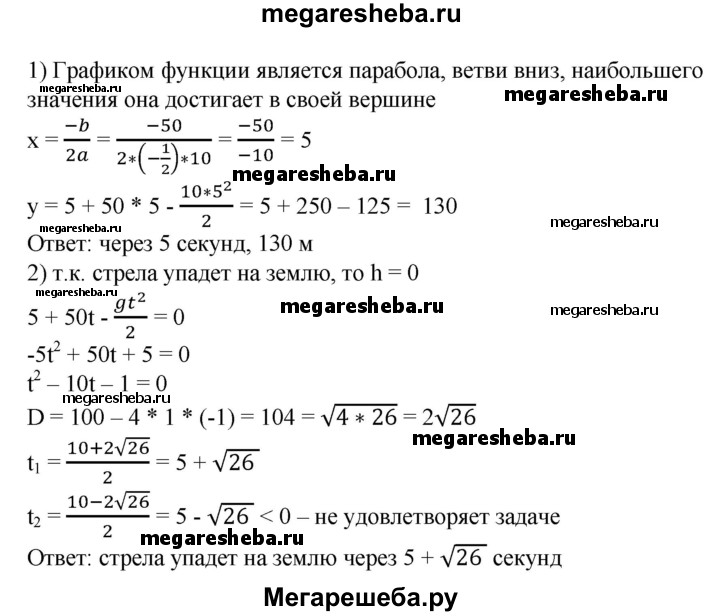633. С высоты 5 м вертикально вверх из лука выпущена стрела с начальной скоростью 50 м/с. Высота h метров, на которой находится стрела через t секунд, вычисляется по формуле h = h(t) = 5 + 50t – gt^2/2, где g принять равным 10 м/с2. Через сколько секунд стрела: 1) достигнет наибольшей высоты и какой; 2) упадет на землю?