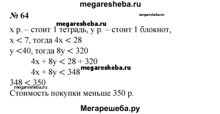 64. Куплены 4 тетради и 8 блокнотов. Цена тетради меньше 7 р., а блокнота меньше 40 р. Показать, что стоимость всей покупки меньше 350 р.
