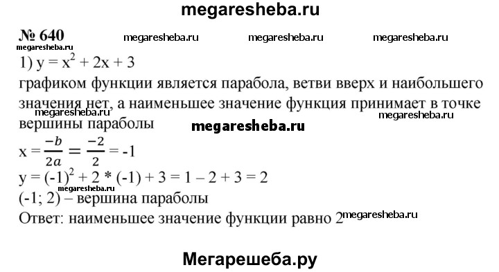 640. Не строя график функции, найти ее наибольшее или наименьшее значение: 1) у = х^2 + 2х + 3; 2) у = -х^2 + 2х + 3; 3) у = -Зх^2 + 7х; 4) у = Зх^2 + 4х + 5.