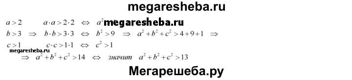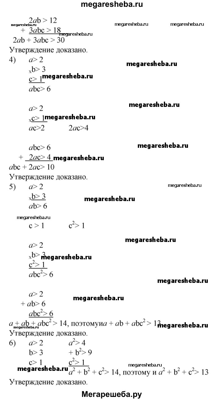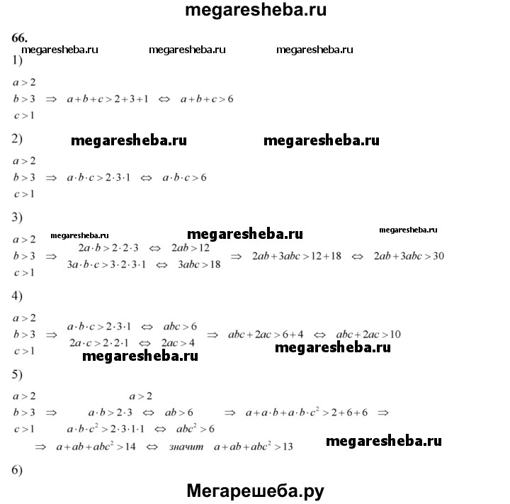 66. Пусть а>2, b> 3, с>1. Доказать, что: 1) а + b + с > 6; 2) abc > 6; 3) 2ab + Заbс > 30; 4) аbс + 2ас >10; 5) a + ab + abc^2 > 13; 6) а^2 + b^2 + с^2 > 13.