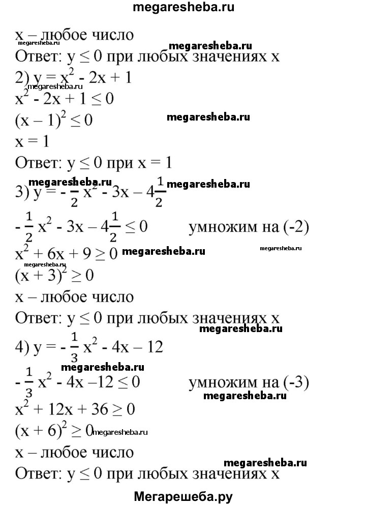 670. Найти все значения х, при которых функция принимает значения, не большие нуля: 1) у = -х^2 + 6х-9; 2) у=х^2-2х + 1; 3) у=-1/2х^2-Зх-4 1/2; 4) y = -1/3х^2-4х-12.