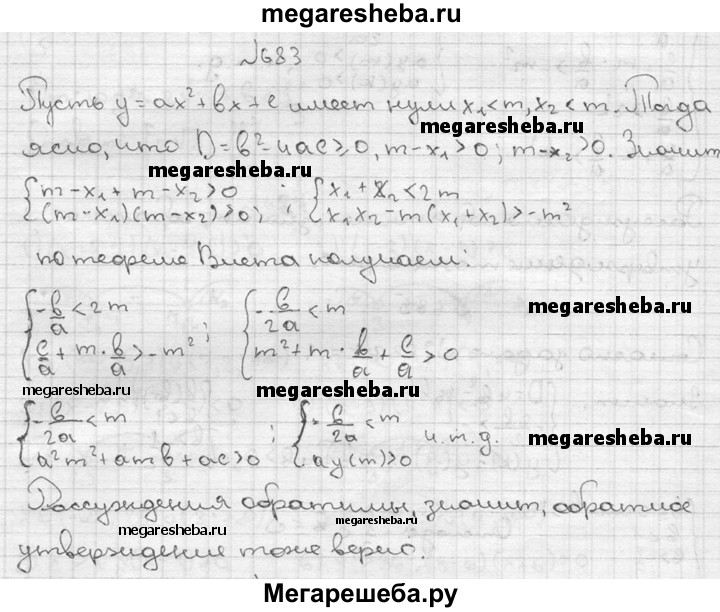 683. Доказать, что квадратичная функция у(х) = ах^2 + bх + с, где а≠ 0, имеет действительные нули x1 и х2 такие, что х1<М, х2 < М, где М — заданное число, только тогда, когда выполняются условия B^2 - 4ас ≥ 0, -b/2a < M, ау(М)> 0.