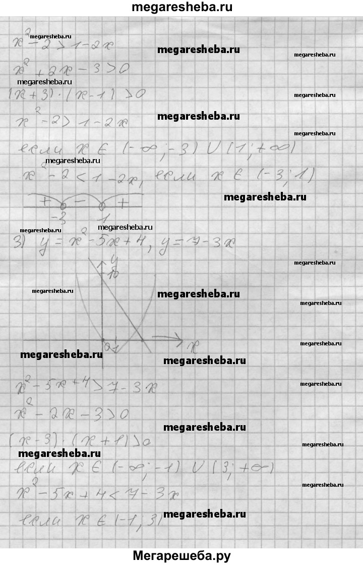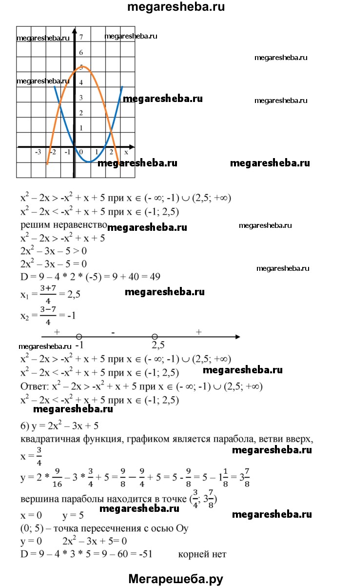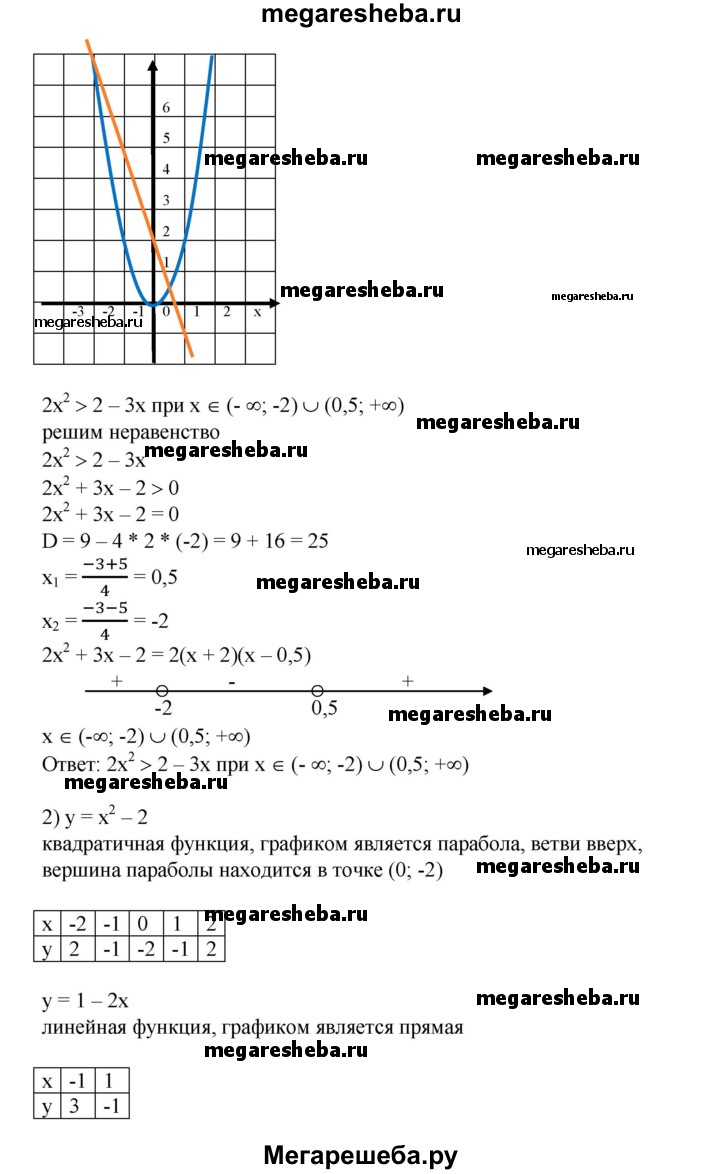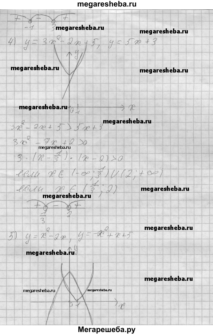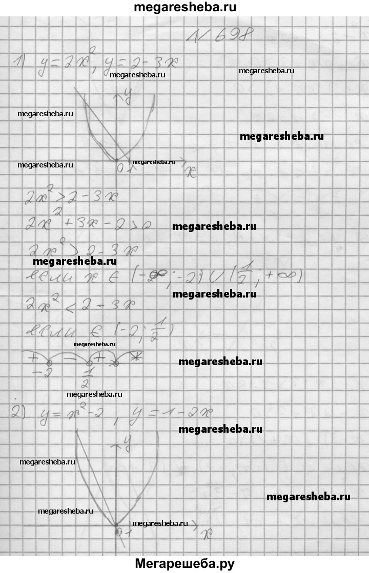 698. В одной системе координат построить графики функций и выяснить, при каких х значения одной функции больше (меньше) значений другой, результат проверить, решив соот-ветствующее неравенство: 1) у = 2х^2, у = 2-3х; 2) у = х^2-2, у = 1-2х; 3) у = х^2 - 5х + 4, у= 7-Зх; 4) у = Зх^2 - 2х + 5, у = 5х + 3; 5) у = х^2- 2х, у = -х^2 + х + 5; 6) у = 2х^2-Зх + 5, у=х^2 + 4х-5.