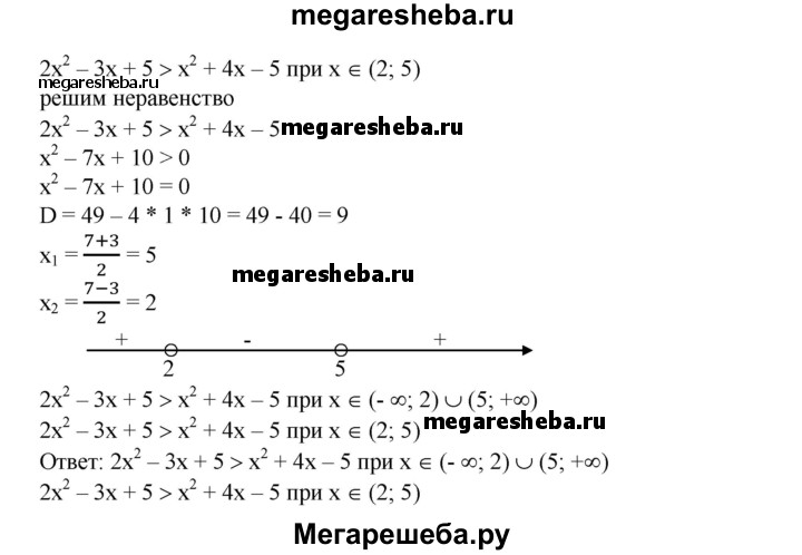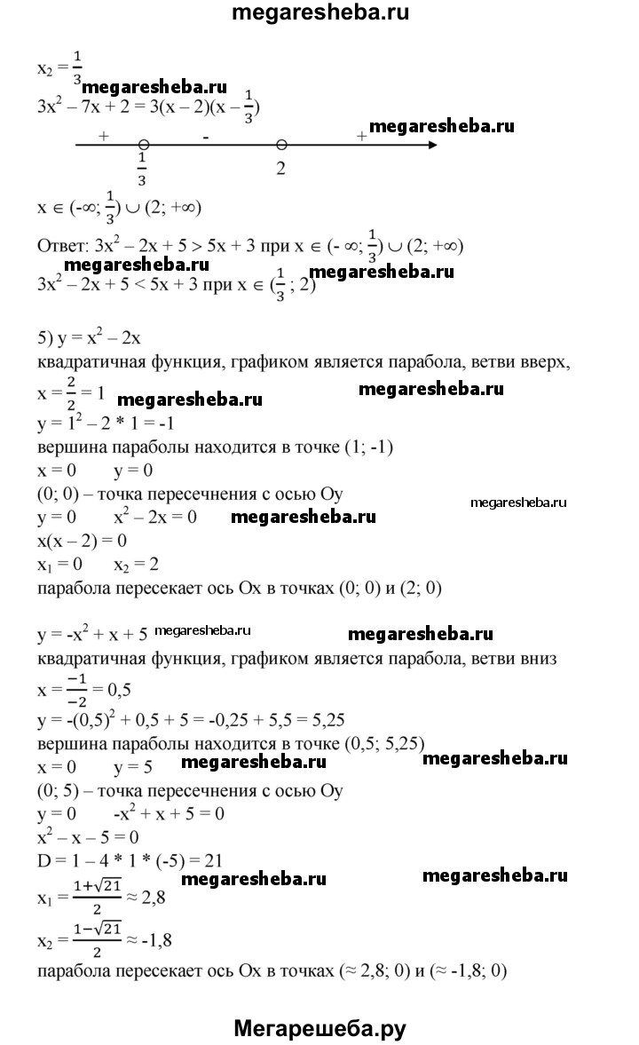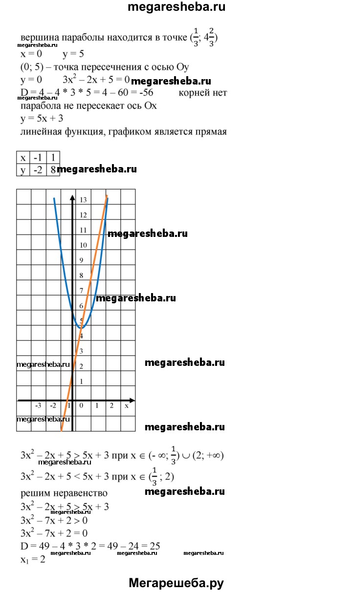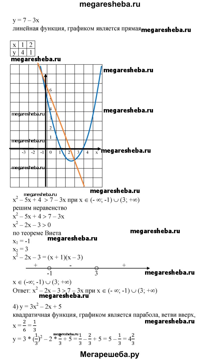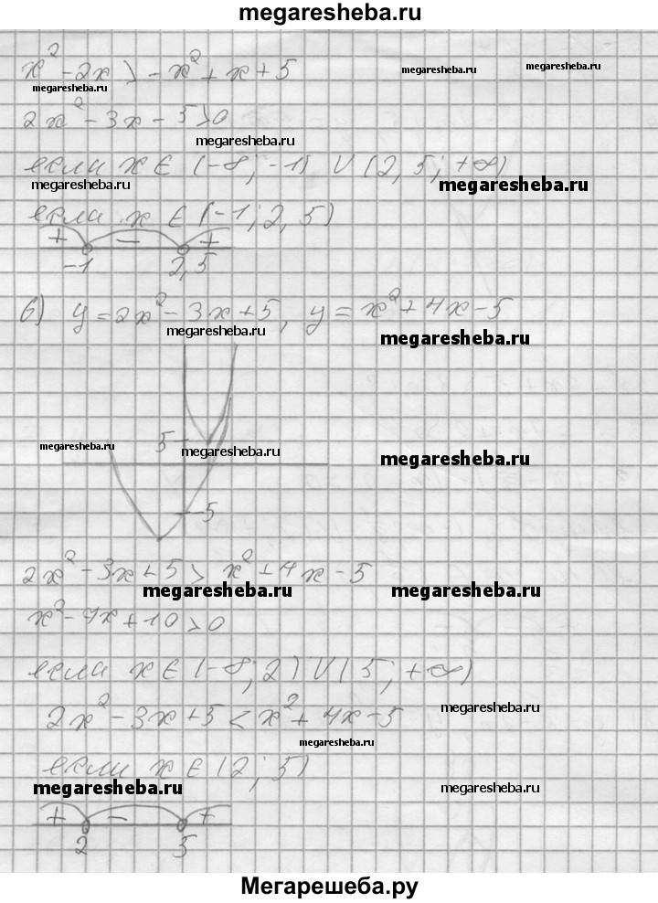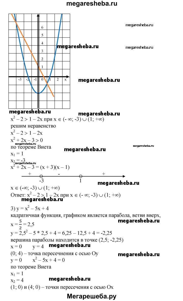 698. В одной системе координат построить графики функций и выяснить, при каких х значения одной функции больше (меньше) значений другой, результат проверить, решив соот-ветствующее неравенство: 1) у = 2х^2, у = 2-3х; 2) у = х^2-2, у = 1-2х; 3) у = х^2 - 5х + 4, у= 7-Зх; 4) у = Зх^2 - 2х + 5, у = 5х + 3; 5) у = х^2- 2х, у = -х^2 + х + 5; 6) у = 2х^2-Зх + 5, у=х^2 + 4х-5.