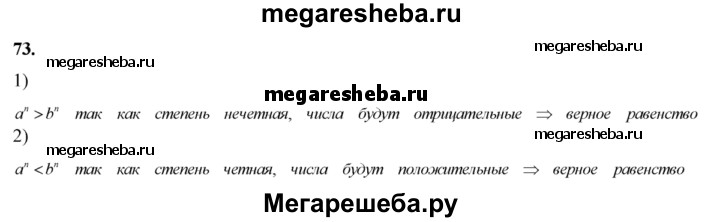 73. Пусть а > b и числа a, b отрицательные. Доказать, что: 1) а^n >b^n, если n — нечетное натуральное число; 2) а^n < b^n, если n — четное натуральное число.