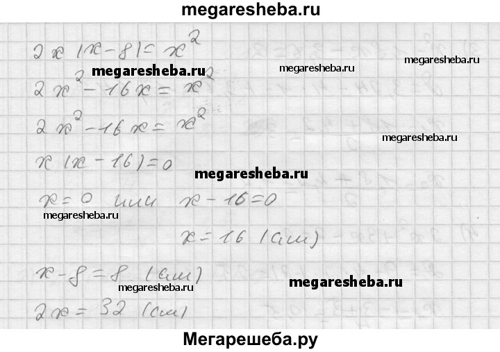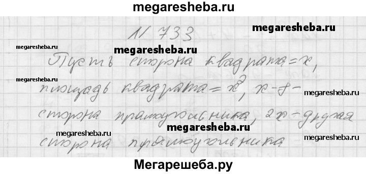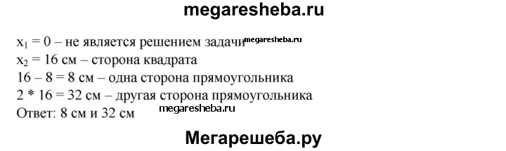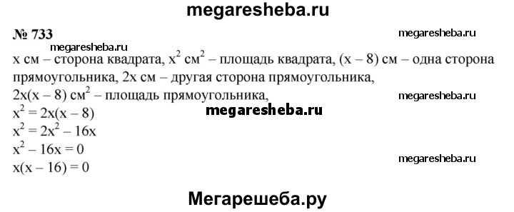 733. Прямоугольник, одна сторона которого на 8 см меньше стороны квадрата, а другая вдвое больше стороны квадрата, имеет площадь, равную площади этого квадрата. Найти стороны прямоугольника.