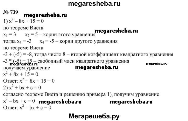739. Записать квадратное уравнение, корни которого отличались бы от корней данного уравнения только знаками: 1) х^2 - 8х + 15 = 0; 2) x^2 + bx + c = 0.