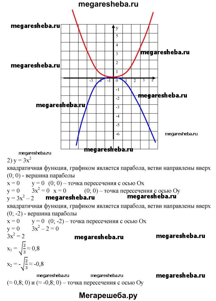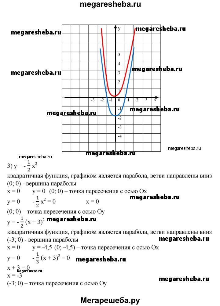 762. На одной координатной плоскости построить графики функций: 1) y=1/3х^2 и у = -1/3х^2; 2) у = Зх^2 и у = Зх^2 - 2; 3) y = -1/2х^2 и у=-1/2(х + З)^2; 4) у = 2х^2 и у = 2(х - 5)^2 + 3.