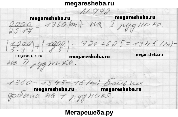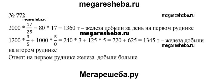 772. На руднике за день добыли 2000 т руды, содержащей 17/25 железа от общей массы руды. На соседнем руднике добыли за первую половину дня 1200 т руды, содержащей 3/5 железа, а за вторую половину дня 1000 т руды, содержащей 5/8 железа. На каком руднике добыли за день больше чистого железа?