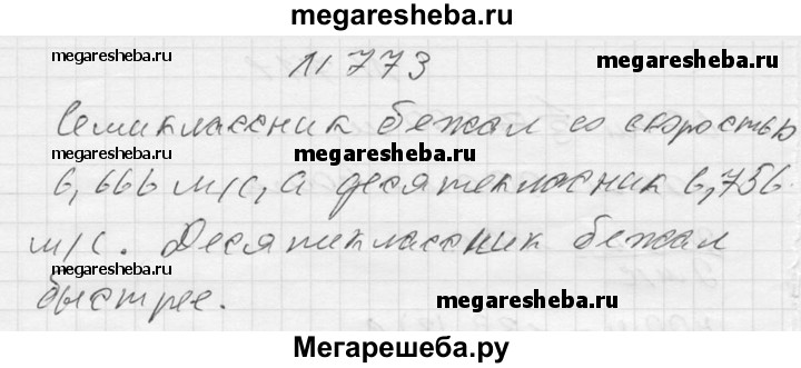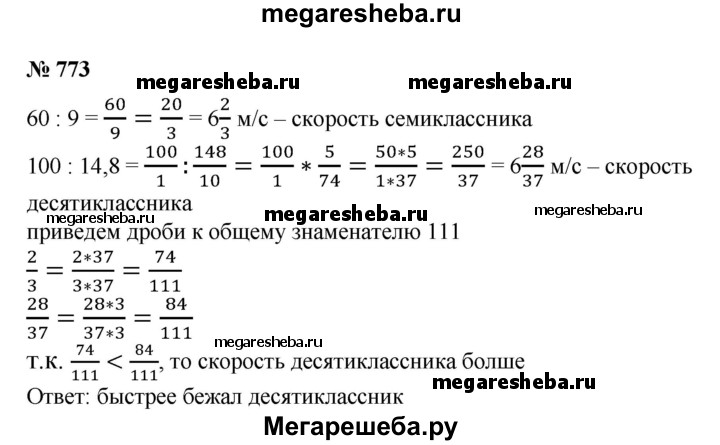 773. На спортивных соревнованиях семиклассник пробежал дистанцию 60 м за 9 с, а десятиклассник — дистанцию 100 м за 14,8 с. Считая, что ученики бежали с постоянными скоростями, выяснить, кто бежал быстрее.