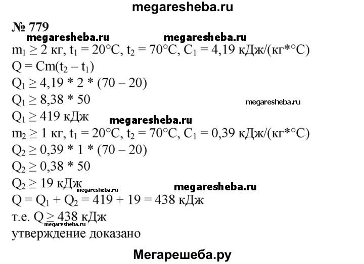 779. Доказать, что на нагревание не менее 2 кг воды в латунном стакане массой не меньше 1 кг от 20 до 70 °С потребуется не менее 438 кДж теплоты. Удельная теплоемкость воды 4,19 кДж/кг * °С), латуни 0,38 кДж/кг * °С).