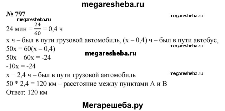 797. Из пункта А в пункт В выезжает грузовой автомобиль со скоростью 50 км/ч. Через 24 мин вслед за ним выезжает автобус со скоростью 60 км/ч. Каково расстояние между пунктами А и В, если грузовой автомобиль и автобус прибыли в пункт В одновременно??