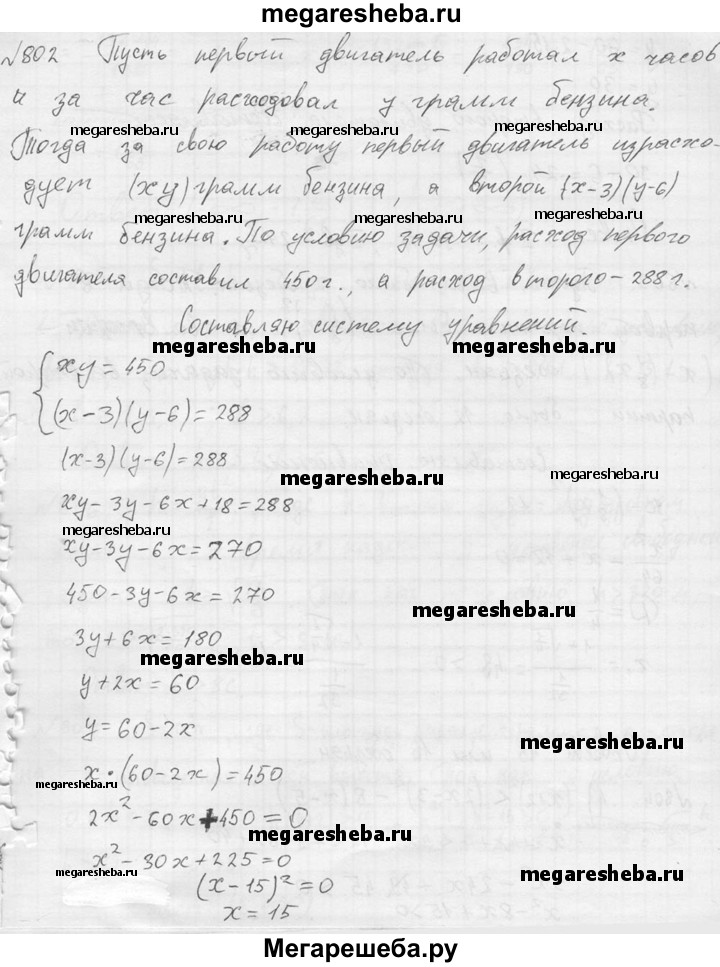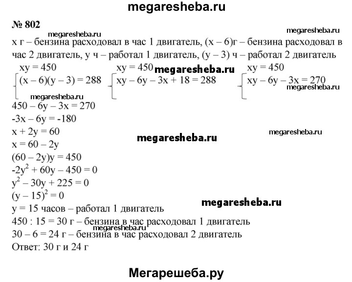 802. При испытании двух двигателей было установлено, что расход бензина при работе первого двигателя составил 450 г, а при работе второго — 288 г, причем второй двигатель работал на 3 ч меньше и расходовал бензина в час на 6 г меньше. Сколько граммов бензина расходует в час каждый двигатель?