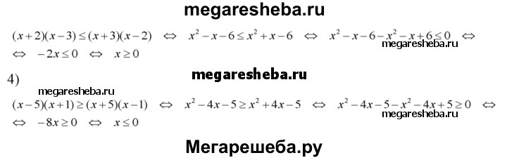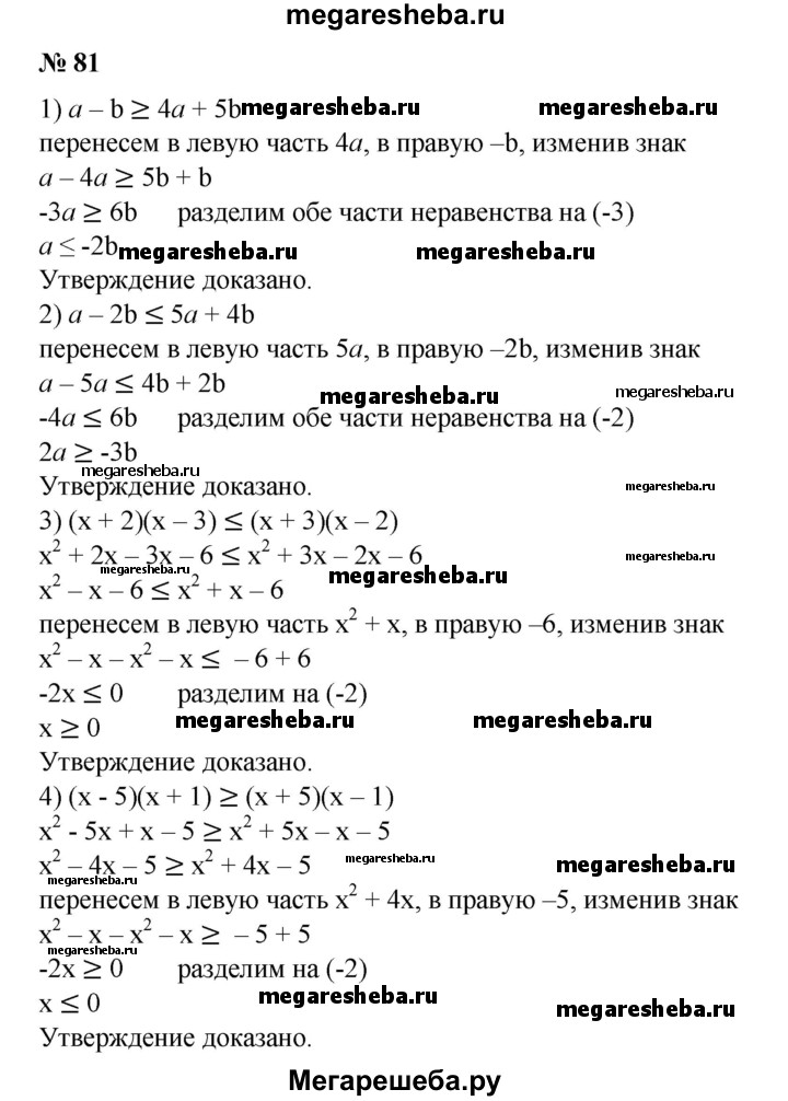81. Доказать, что: 1) если а - b ≥ 4а + 5b, то а ≤ - 2b; 2) если а – 2b ≤ 5а + 4b, то 2а ≥ - 3b; 3) если(х + 2)(х-3)≤(х + 3)(х-2),то х≥0; 4) если ( x - 5)(х + 1) ≥ (х + 5)(х - 1), то х ≤ 0.
