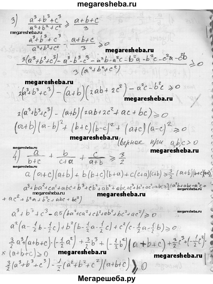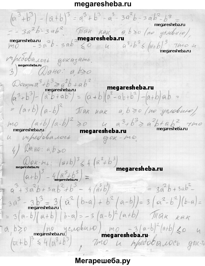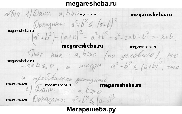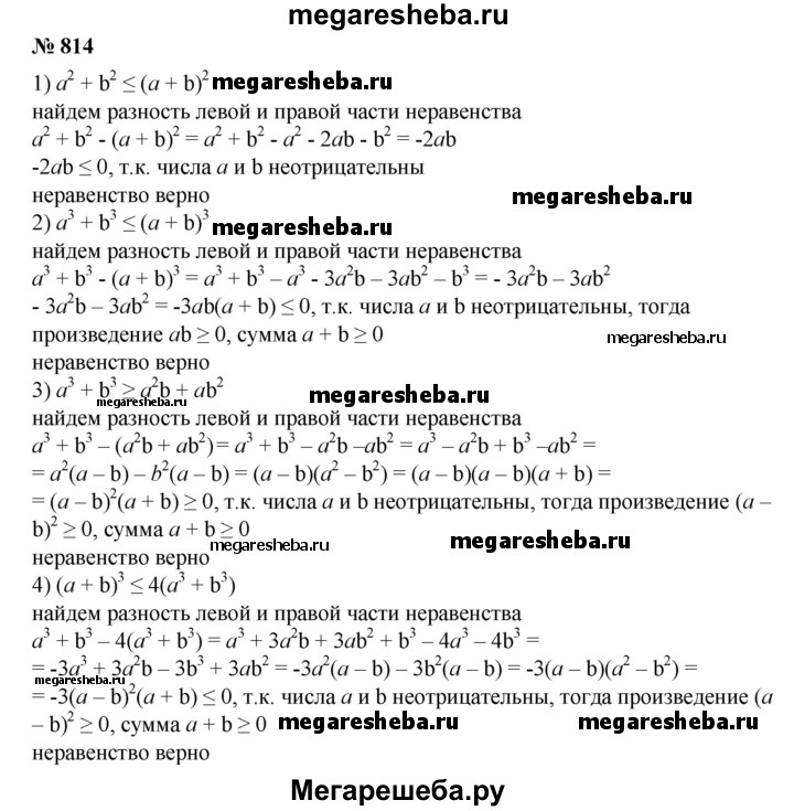 814. Доказать, что для любых неотрицательных чисел а и b справедливо неравенство: 1) а^2 + b^2 ≤(а+b)^2; 2) а^3+ b^3 ≤(а+b)^3; 3) a^3 + b^3 ≥a^2b + ab^2; 4) (а+b)^3 ≤4(а^3 + b^3).